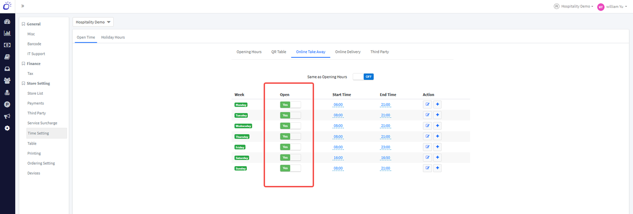 - 建议: 在后台进入 Time Setting → Open Time → Online Takeaway/Delivery,将当日营业状态从 Open 切换为 Closed,避免断网期间继续收到预定订单。网络恢复后再切换回 Open。