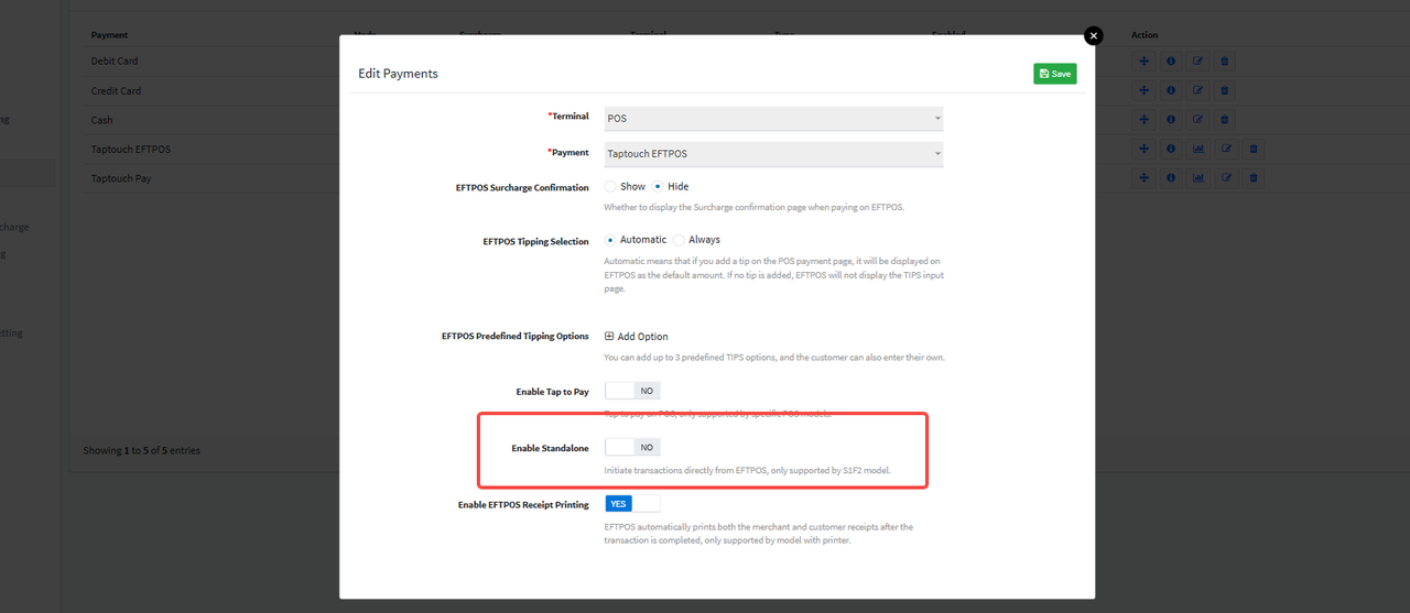- 在 POS 后台进入 Setting → Payments,点击 编辑,开启 Standalone 模式。